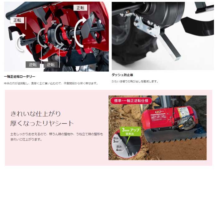 爪がすばやく土に食い込み、作業開始からしっかり耕うん。飛び出しにくいので粘土質な畑や未耕地にもおすすめ