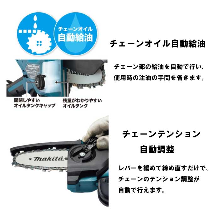 ・標準付属品 : チェーンオイル/チェーンカバー/バッテリBL1860B(6.0Ah)×1本/充電器DC18RF×1台